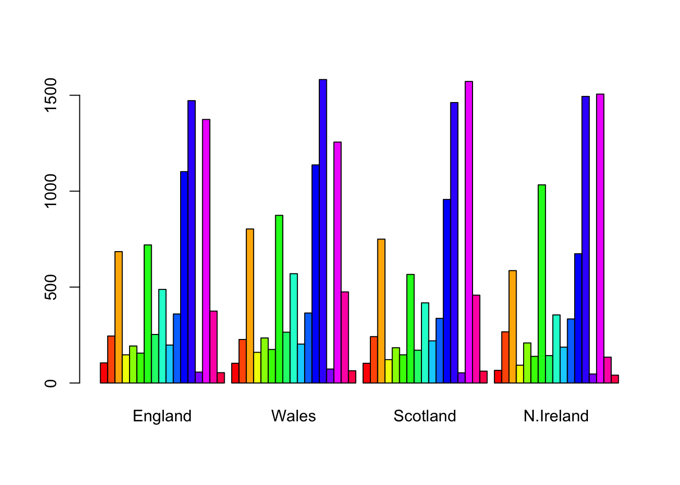 barplot(as.matrix(x), beside=T, col=rainbow(nrow(x)))