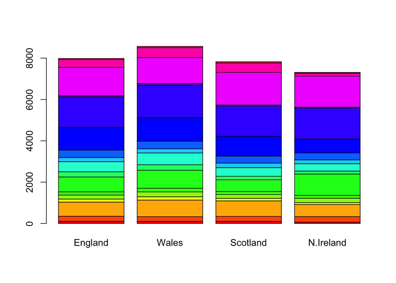 barplot(as.matrix(x), beside=F, col=rainbow(nrow(x)))