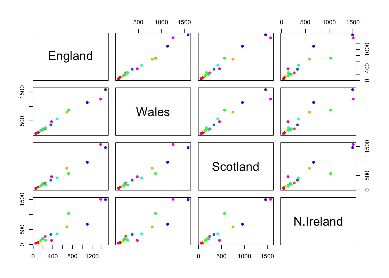 pairs(x, col=rainbow(nrow(x)), pch=16)
