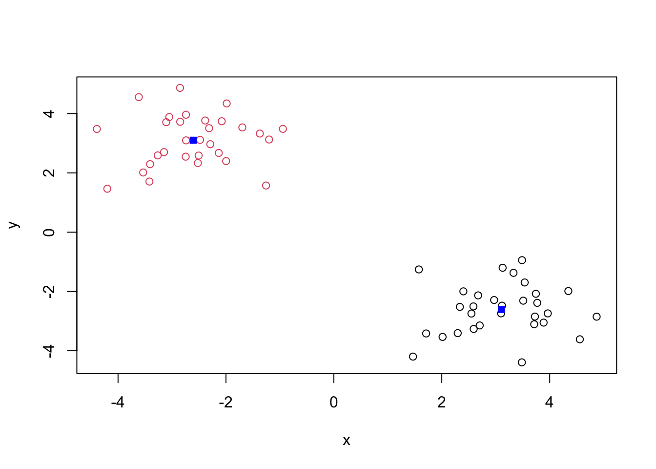 points(km$centers, col="blue", pch=15)