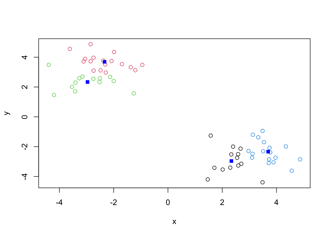 points(k4$centers, col="blue", pch=15)
